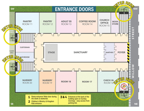 As the crews start working on the new ramp, the plan is that they will also start working on the front steps of the building. Starting Monday, December 4th, please plan to use the northwest door on the west side of the building as the main door. On Sunday mornings, we will utilize all four corner doors around the building to help with traffic flow in and out of the service (see below):
