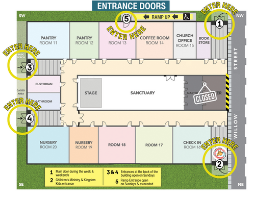 As a reminder for parents and guardians that need to enter into the KidMin wing please utilize the exterior door (#2) at the NE side of the building, or if coming in a different entrance come to the check in available outside of the nursery rooms.