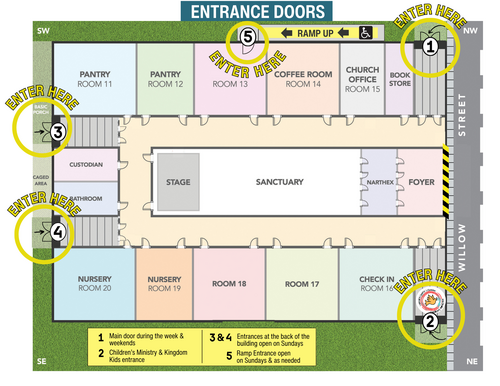 During the week, the main entrance will be door #1, or the Northwest Door (formerly the True Life Door) - this will be right next to the newly located ramp, available on Sundays and as needed. For Wednesday Night’s Kingdom Kids - Please enter through the new Kid Ministry Door (#2), at the Northeast side of the building.